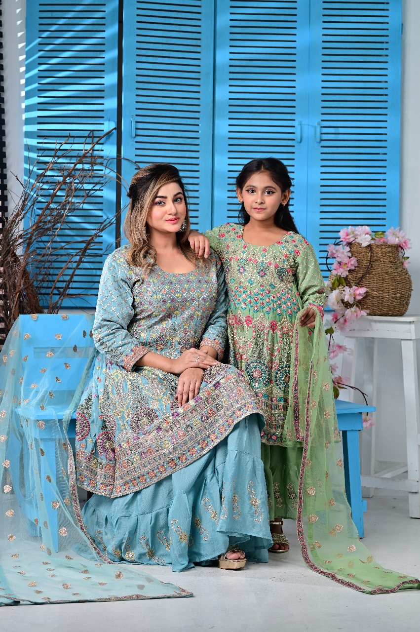 Celebrate your special moments with our stunning Big & Baby Combo Gown Set – crafted from premium Indian fabric with beautiful embroidery and zari work.