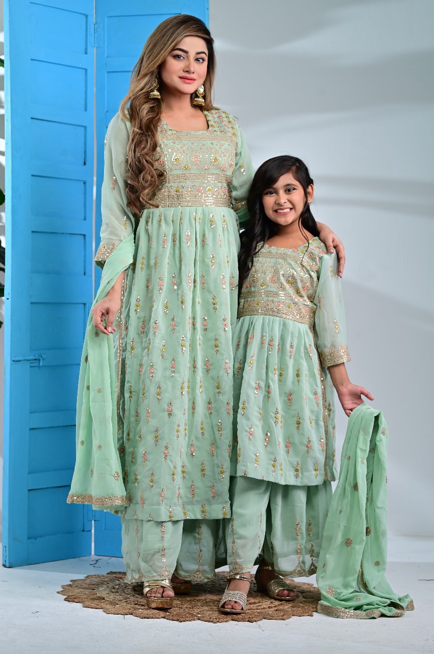 Celebrate your special moments with our stunning Big & Baby Combo Gown Set – crafted from premium Indian fabric with beautiful embroidery and zari work.